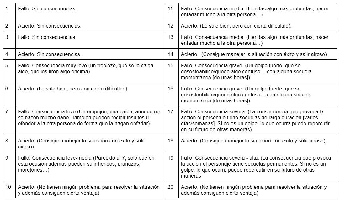 ⇻ Para peleas y situaciones de ese estilo, usaré también los dados y os diré las consecuencias; para ello usaré de base la tabla de la trama anterior.